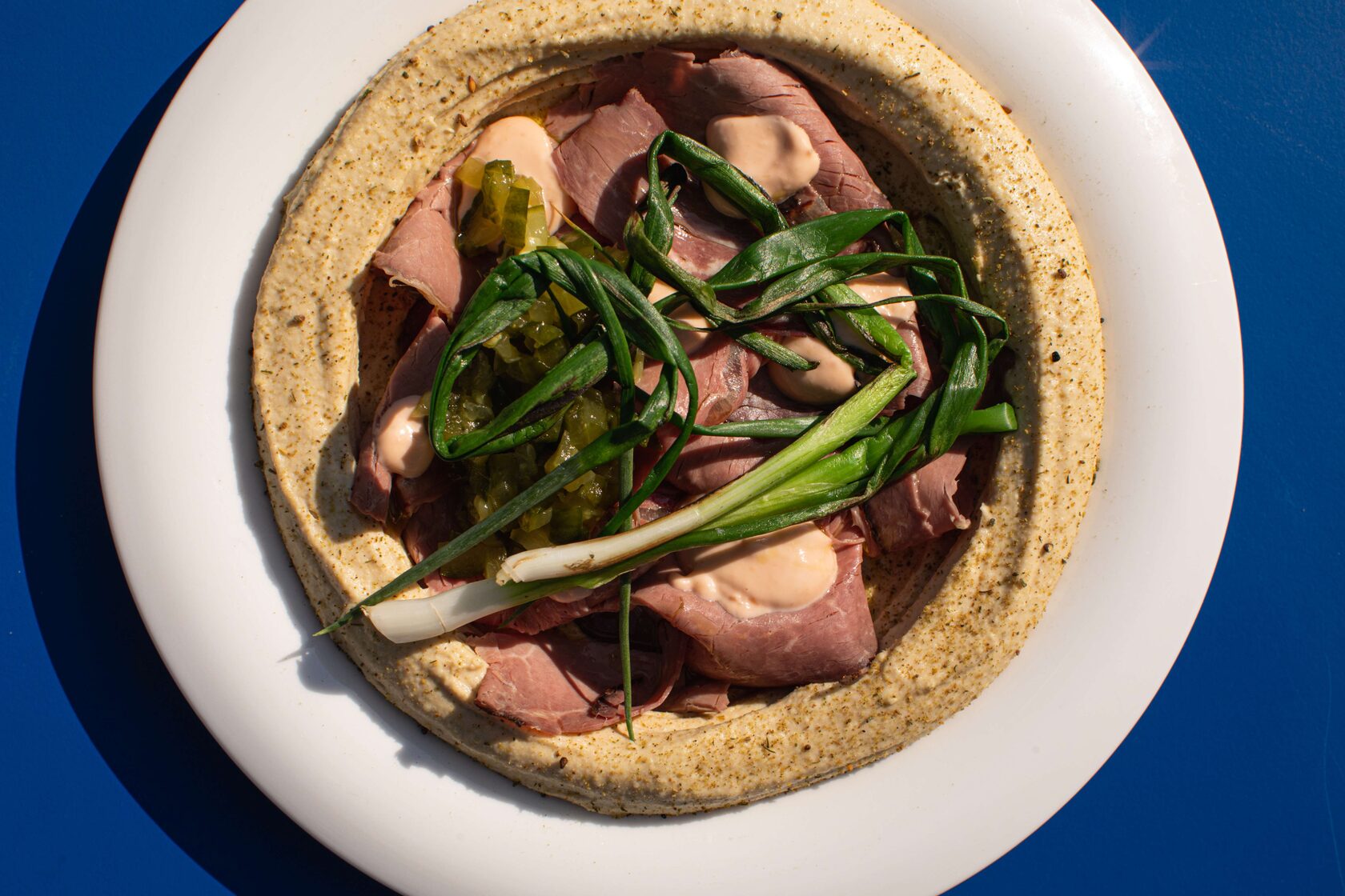 — Хумус с пастрами из говядины - кремовый хумус с пряной пастрами и характерными еврейскими огурчиками.