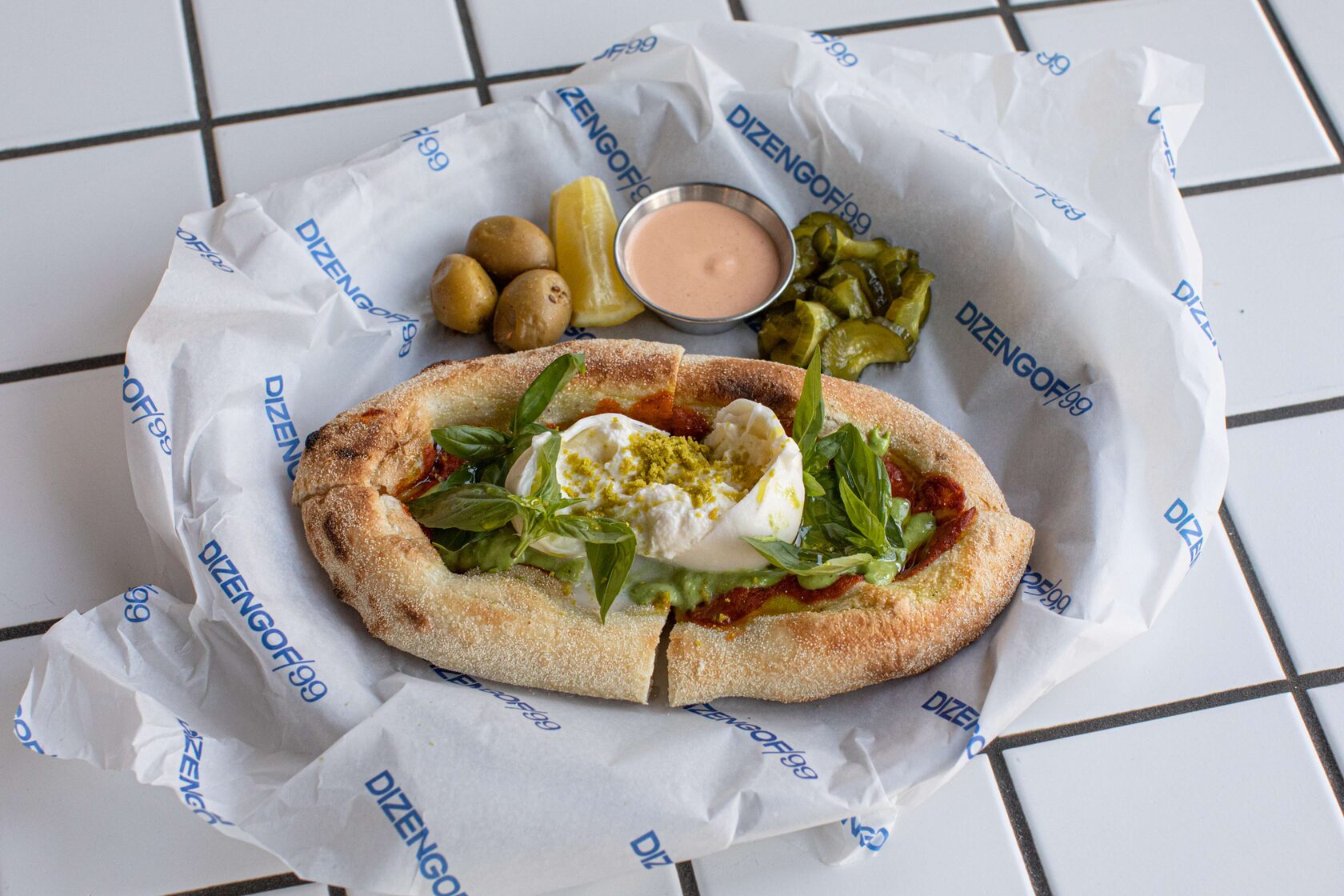 — Флетбред буррата с фисташкой и зеленой тхиной