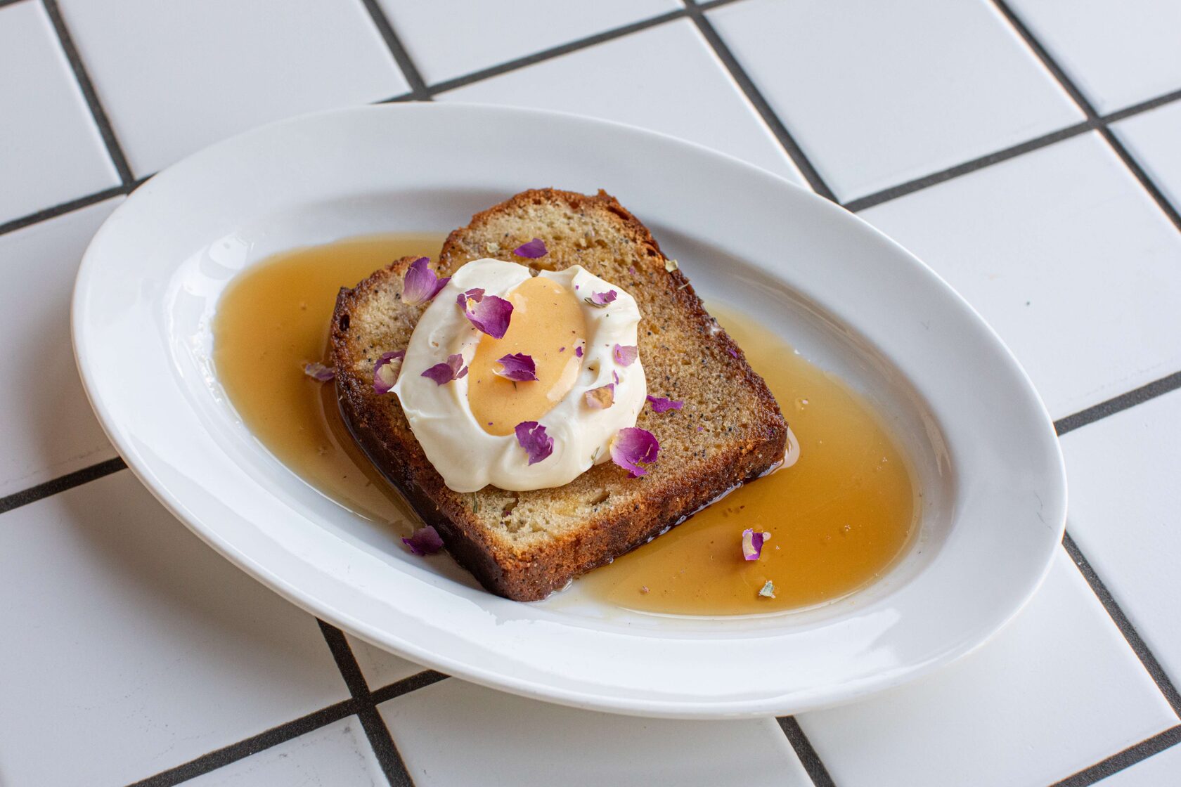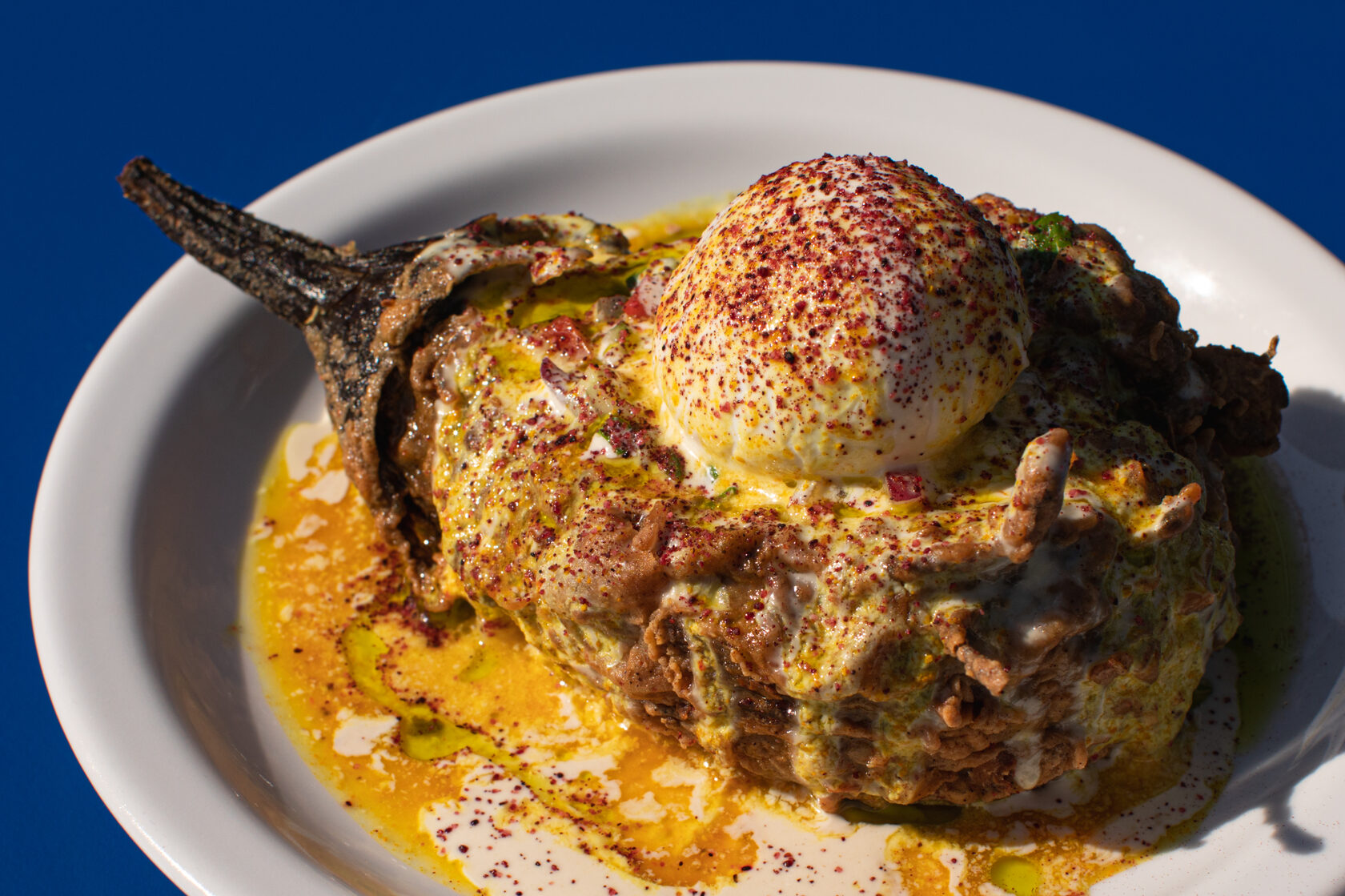 — Баклажан сабих с тхиной и амбой - хрустящий баклажан-лодочка с пашотом и восточными соусами.